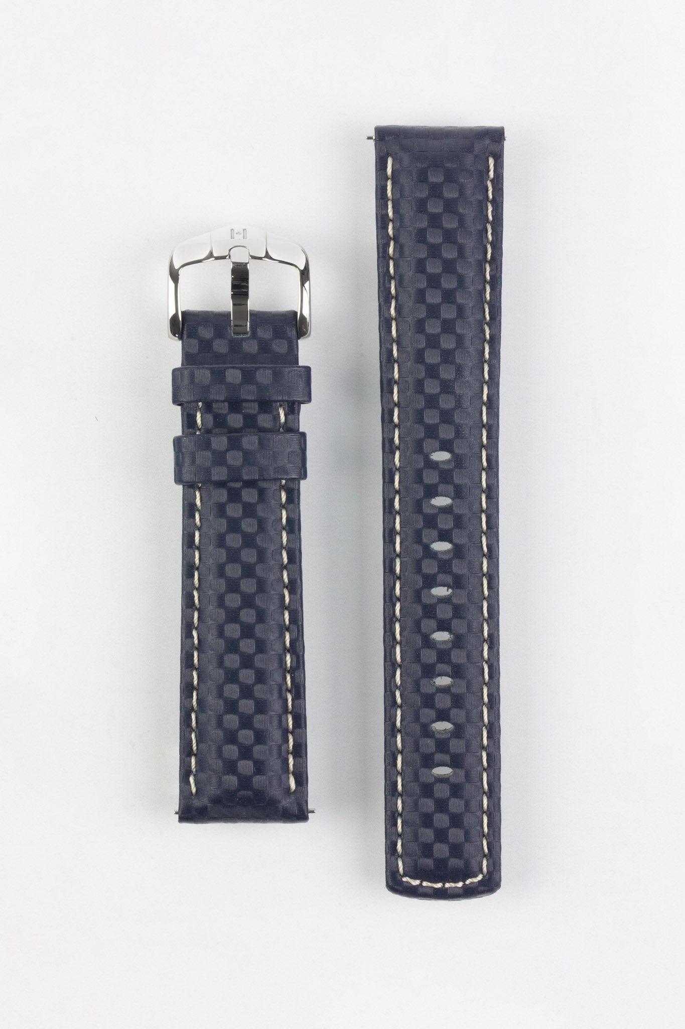 A highly durable sports strap with a thoroughly modern design, this strap bears a finely-embossed carbon-fibre texture and a unique rubber-feel leather lining underneath, for a uniquely tactile feel. Couple with water resistance to depths of up to 100m and you end up with a watch accessory that's ready for just about anything the world can throw at it.