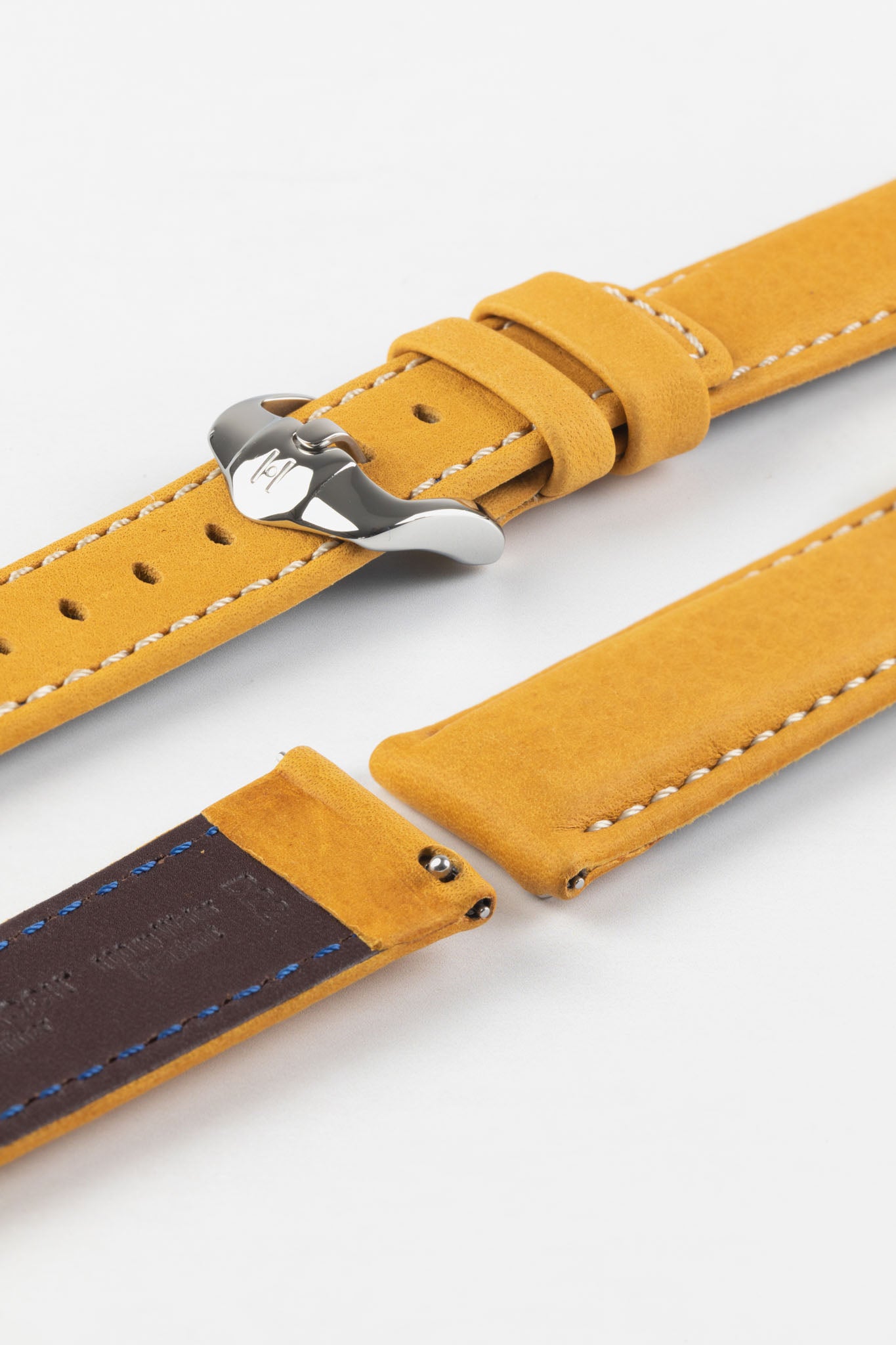 The Mariner's signature is its finish; a wax-coating atop traditional saddle leather creates a surface with a pleasingly velvet-like texture, while also providing the strap with water resistance, making it an excellent multipurpose diving strap. The look is completed with rectangular padding and parallel contrast stitching, making for a modern, bold accent to an otherwise traditional leather strap.
